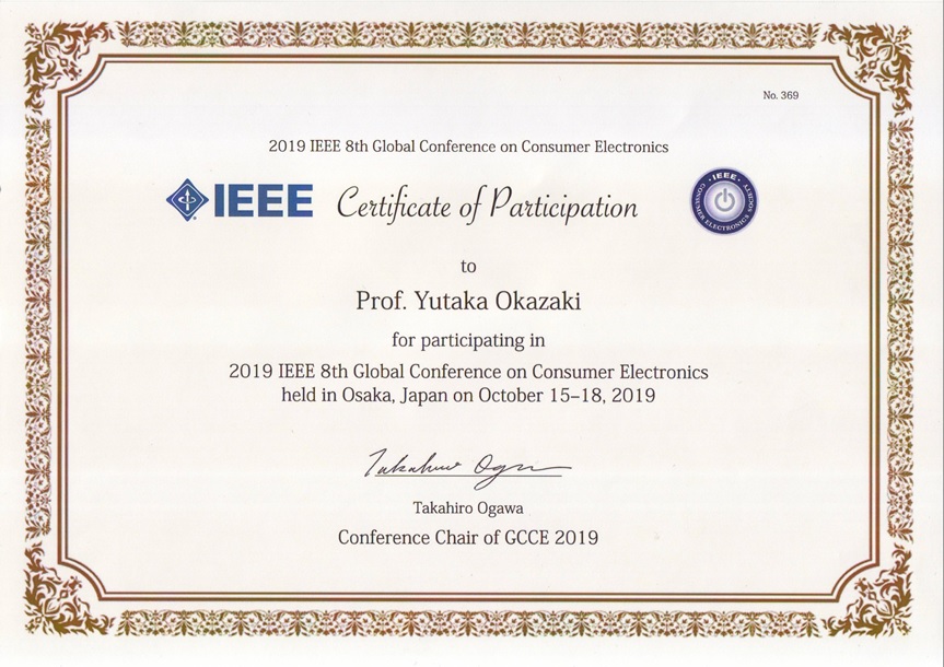 2019 IEEE 8th Global Conference on Consumer Electronics(GCCE 2019)は、IEEE Consumer Electronics Societyが主催する毎年恒例の国際会議. これは、米国ラスベガスで開催されるCESと連動したコンシューマーエレクトロニクス国際会議(ICCE)の姉妹会議となります.SPAは"A Novel Pulse Wave Analyzer for Personal Health Monitoring"として投稿、Home and Personal Healthcare カテゴリーDemo!に採択されました.